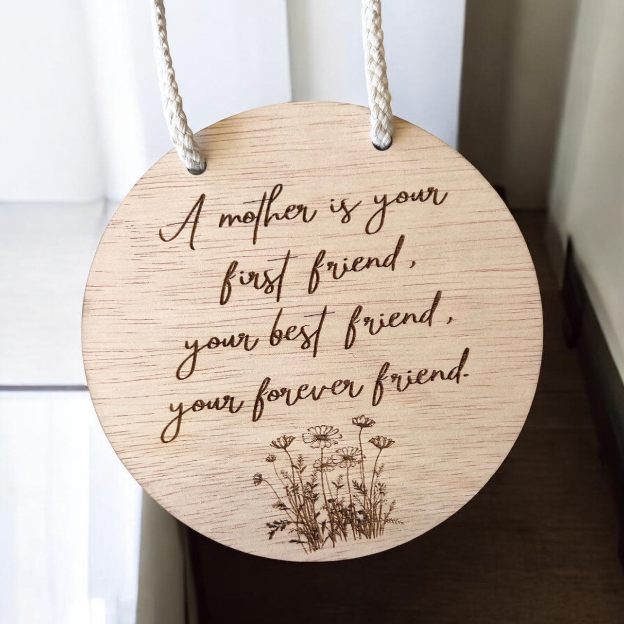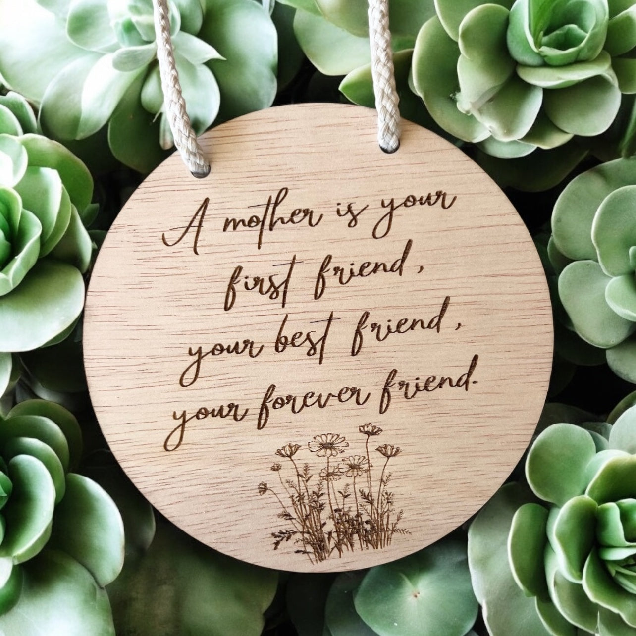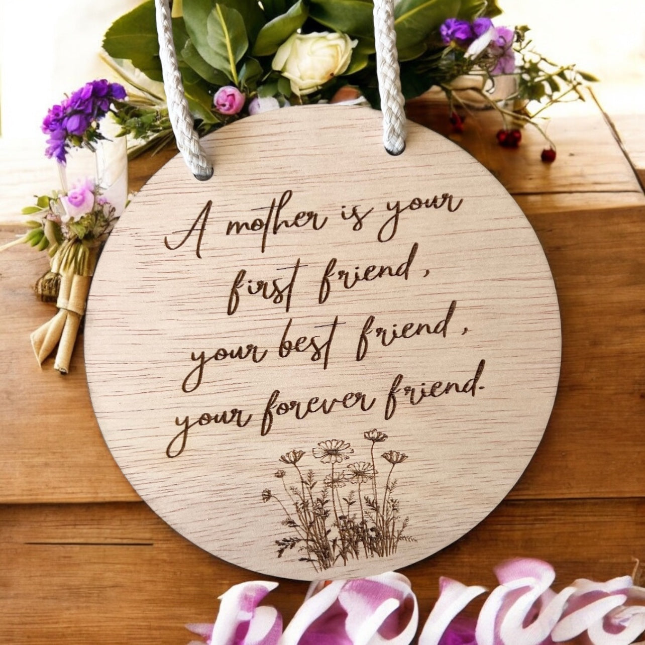 Celebrate mum with our beautifully crafted Mother's Day Wood Plaque! Engraved with a heartfelt quote and adorned with wild flowers, this 15cm round plaque is a great gift idea for your first, best, and forever friend. Hand crafted in Sydney, it comes ready to hang with a rope. Show your love and appreciation with this special gift for mum.