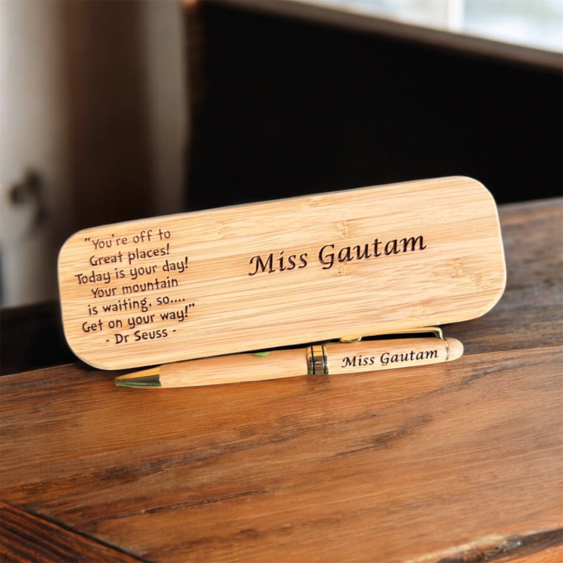 Teachers Gift Bamboo Engraved ball point black pen and case set Great gift Idea